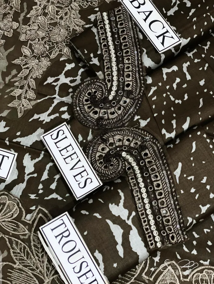 Printed lawn front with heavy embroidered spengle work neck patch with 3D flower attached & heavy daman boarder